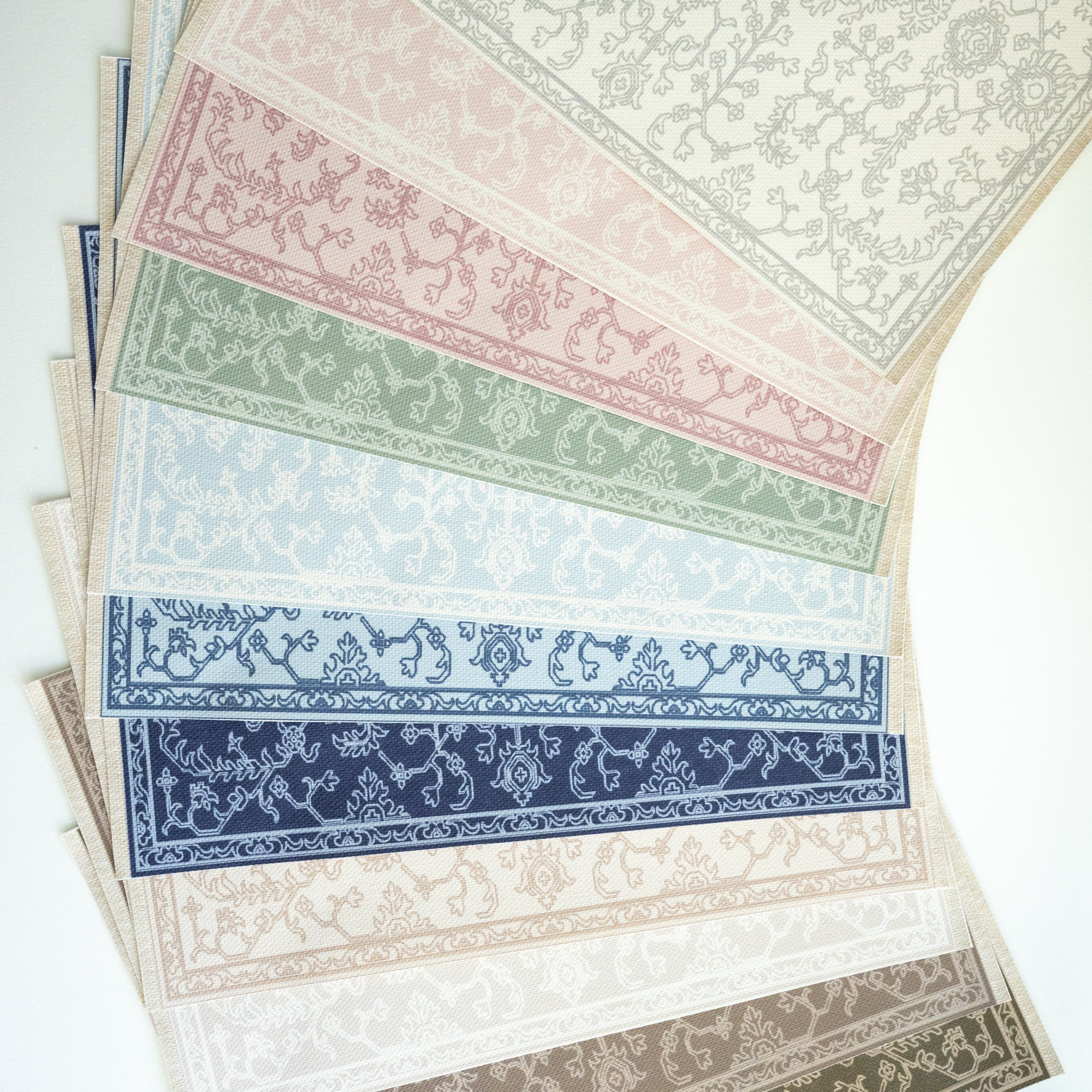 My rugs are printed on high-quality canvas that has a great weight to it and lays flat nicely. It is my preferred material for dollhouse rugs. I would recommend using some double-sided tape on the corners to keep the rug from moving around.
